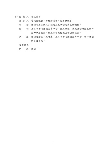 七、提 案 人:秦鉦議員 連 署 人:曾紀嚴議員、鄭愷玲議員、俞叁發議員 案 由:建請研商安樂路二段陽光洗車場候車區域調整。 說 明:基隆市身心障礙洗車中心,服務量佳,車輛進場排隊區域與 主幹車道並行,顧及安全應於做適宜調整改善。 辦 法:建請交通處、社會處、基隆市身心障礙洗車中心,聯合會勘 調整改善之。 審查意見: 議 決:通過。 ~5~ 5