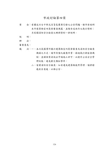 市政討論第四案 案 由:有關近日台中新光百貨氣爆案引發之公安問題,請市府說明 本市建築物室內裝修審查規範,並報告近兩年之執行情形; 另有關消防安全檢查之辦理情形一併說明。 說 明: 辦 法: 審查意見: 議 決:一、本次氣爆事件揭示建築物室內裝修審查及消防安全檢查 機制之不足,請市府強化稽查作業,精進執行與監督機 制,並確保業者依法申請施工許可,以提升公共安全管 理效能,避免發生類似事件。 二、有關消防安全檢查,如有違反建築物使用管理,請都發 處配合查處,以維公安。 126