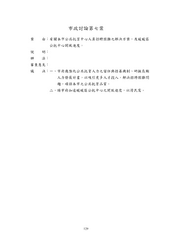 市政討論第七案 案 由:有關本市公共托育中心人員招聘困難之解決方案,及暖暖區 公托中心開放進度。 說 明: 辦 法: 審查意見: 議 決:一、市府應強化公共托育人力之留任與招募機制、研擬長期 人力發展計畫,以吸引更多人才投入,解決招聘困難問 題,確保本市之公共托育品質。 二、請市府加速暖暖區公托中心之開放進度,以符民需。 129