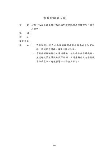 市政討論第八案 案 由:針對行人友善政策推行及開放騎樓停放機車辦理情形,請市 府說明。 說 明: 辦 法: 審查意見: 議 決:一、市府現行之行人友善與騎樓開放停放機車政策似有相 悖,造成民眾困擾,請審慎檢討改進。 二、市府應確保騎樓行人通道暢通,強化標示與管理機制, 並透過政策宣導提升民眾認同,同時兼顧行人友善及機 車停放需求,避免影響行人安全與市容。 130