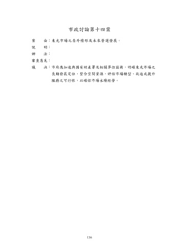 市政討論第十四案 案 由:東光市場之委外情形及未來營運發展。 說 明: 辦 法: 審查意見: 議 決:市府應加速與國有財產署及相關單位協商,明確東光市場之 長期發展定位,整合空間資源,評估市場轉型、改造或提升 服務之可行性,以確保市場永續經營。 136