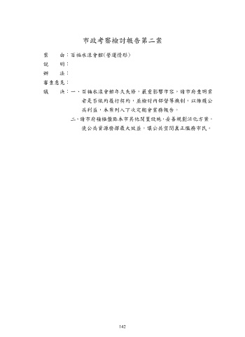 市政考察檢討報告第二案 案 由:百福水漾會館(營運情形) 說 明: 辦 法: 審查意見: 議 決:一、百福水漾會館年久失修,嚴重影響市容,請市府查明業 者是否依約履行契約,並檢討內部督導機制,以維護公 共利益,本案列入下次定期會業務報告。 二、請市府積極盤點本市其他閒置設施,妥善規劃活化方案, 使公共資源發揮最大效益,讓公共空間真正服務市民。 142