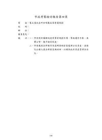 市政考察檢討報告第四案 案 由:舊正濱派出所咖啡廳未來營運規劃 說 明: 辦 法: 審查意見: 議 決:一、市府對於場館的使用事前規劃不周,導致運作不彰、浪 費公帑,應予檢討改進。 二、市府應依法律程序及透明原則妥善處理公共資產,並強 化公務人員法律教育與培訓,以確保政府資產管理合法 化。 144
