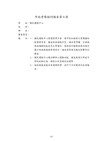 市政考察檢討報告第七案 案 由:國民運動中心 說 明: 辦 法: 審查意見: 議 決:一、國民運動中心營運管理不善,請市府加強對主管機關的 監督與究責,儘速改善通風不良、漏水等問題,全面檢 視各場館設施是否正常運作,確保委外廠商依契約規定 履行設施維護與管理責任,避免因管理失職而影響市民 權益。 二、國民運動中心應回歸核心運動功能,避免與原訂用途不 符的出租行為,確保公共資源有效運用。 三、請政風處查處本案違規情事,並於下次定期會向本會報 告。 147