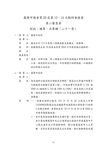 基隆市議會第 20 屆第 13、14 次臨時會提案