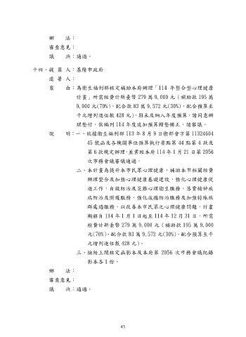 案 由:為衛生福利部核定補助本府辦理「114 年整合型心理健康