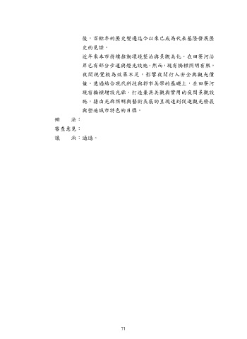 後,百餘年的歷史變遷迄今以來已成為代表基隆發展歷 史的見證。 近年來本市持續推動環境整治與景觀美化,在田寮河沿 岸已有部分步道與燈光設施。然而,現有橋樑照明有限, 夜間視覺較為效果不足,影響夜間行人安全與觀光價 值。透過結合現代科技與都市美學的基礎上,在田寮河 現有橋樑增設光廊,打造兼具美觀與實用的夜間景觀設 施。藉由光廊照明與藝術美感的呈現達到促進觀光發展 與塑造城市特色的目標。 辦 法: 審查意見: 議 決:通過。 ~71~ 71