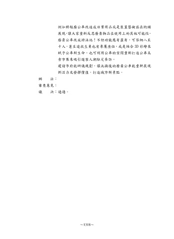 例如將報廢公車改造成日常用品或是裝置藝術並在街頭 展現,讓大家重新反思廢棄物品在使用上的其他可能性。 廢棄公車改成游泳池!不但功能應有盡有,可容納八至 十人,甚至連救生員也有專屬座位,或是結合 3D 彩繪來 賦予公車新生命,也可利用公車的空間重新打造公車美 食市集來吸引遊客人潮駐足參訪。 建請市府能研議規劃,讓汰換後的廢棄公車能重新展現 新活力及發揮價值,打造城市新景點。 辦 法: 審查意見: 議 決:通過。 ~1318~