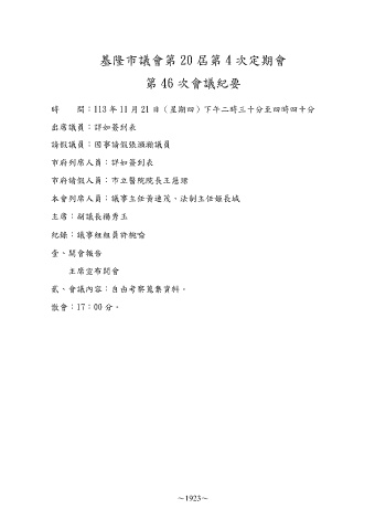 基隆市議會第 20 屆第 4 次定期會 第 46 次會議紀要 時 間:113 年 11 月 21 日(星期四)下午二時三十分至四時四十分 出席議員:詳如簽到表 請假議員:因事請假張灝瀚議員 市府列席人員:詳如簽到表 市府請假人員:市立醫院院長王慧珺 本會列席人員:議事主任黃連茂、法制主任姬長城 主席:副議長楊秀玉 紀錄:議事組組員許椀喻 壹、開會報告 主席宣布開會 貳、會議內容:自由考察蒐集資料。 散會:17:00 分。 ~1923~