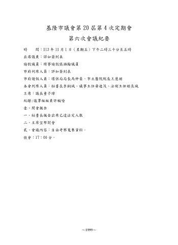 基隆市議會第 20 屆第 4 次定期會 第六次會議紀要 時 間:113 年 11 月 1 日(星期五)下午二時三十分至五時 出席議員:詳如簽到表 請假議員:因事請假張灝翰議員 市府列席人員:詳如簽到表 市府請假人員:環保局局長馬仲豪、市立醫院院長王慧珺 本會列席人員:秘書長李銅城、議事主任黃連茂、法制主任姬長城 主席:議長童子瑋 紀錄:議事組組員許椀喻 壹、開會報告 一、秘書長報告出席已達法定人數 二、主席宣布開會 貳、會議內容:自由考察蒐集資料。 散會:17:00 分。 ~1999~