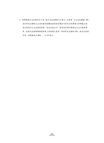 七 、 娛樂稅稅式支出項目共 2 項,稅式支出金額約 37 萬元。主要為「公立文化機關(構) 或合於民法總則之公益社團或財團或依其他有關法令經向目的事業主管機關立案 或法院登記之文化藝術事業、依法完成公司、商業或有限合夥登記之文化藝術事 業,從事文化藝術獎助條例第 2 條有關之表演、映演等文化藝術活動,經文化部認 可者,娛樂稅減半課徵。」計 30 萬元。 19 ~2315~