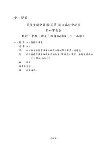 壹、提案 基隆市議會第 20 屆第 12 次臨時會提案 第一審查會 民政、警政、衛生、社會福利類(三十二案) 一、提 案 人:基隆市議會 連 署 人: 案 由:檢送基隆市議會組織自治條例修正草案,請審議。 說 明:基隆市議會組織自治條例第 27 條修正草案,含總說明及條 文對照表(如附件)。 辦 法: 審查意見: 議 決:通過。 ~2625~