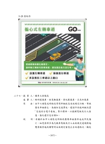 3-26 案附件 二十七、提 案 人:楊秀玉副議長 連 署 人:陳明建議員、林旻勳議員、曾紀嚴議員、呂美玲議員 案 由:本市七堵區光明路段常因車輛疏忽未依規定行駛,導致 屢有車禍發生,為預防交通事故,建請市府能研擬設置 「交通安全電子看板」警示標語,以提醒駕駛及行人留 意,強化遵守交安頇知。 說 明:有鑑於本市七堵區光明路段屢傳車禍案件造成市民傷 亡,細究原因多為汽機車駕駛及行人未依規定違規跨越 雙黃線穿越及轉彎時未依規定留意左右兩邊路況,顯見 ~2672~