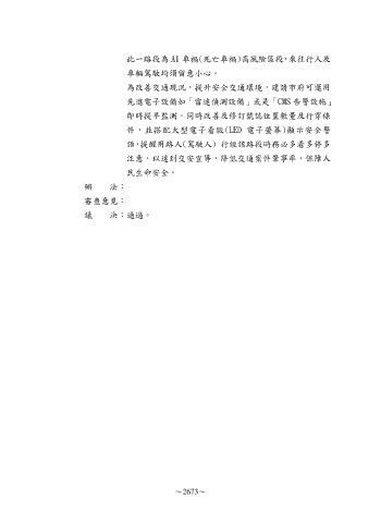 此一路段為 A1 車禍(死亡車禍)高風隩區段,來往行人及 車輛駕駛均頇留意小心。 為改善交通現況,提升安全交通環境,建請市府可運用 先進電子設備如「雷達偵測設備」或是「CMS 告警設施」 即時提早監測,同時改善及修訂號誌位置數量及行穿條 件,並搭配大型電子看版(LED 電子螢幕)顯示安全警 語,提醒用路人(駕駛人) 行經該路段時務必多看多停多 注意,以達到交安宣導,降低交通案件肇事率,保障人 民生命安全。 辦 法: 審查意見: 議 決:通過。 ~2673~