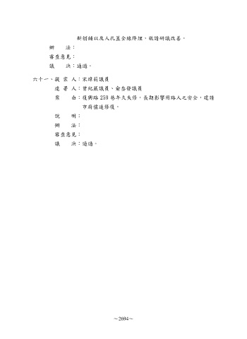 新刨鋪以及人孔蓋全線降埋,敬請研議改善。 辦 法: 審查意見: 議 決:通過。 六十一、提 案 人:宋瑋莉議員 連 署 人:曾紀嚴議員、俞叁發議員 案 由:復興路 259 巷年久失修,長期影響用路人之安全,建請 市府儘速修復。 說 明: 辦 法: 審查意見: 議 決:通過。 ~2694~