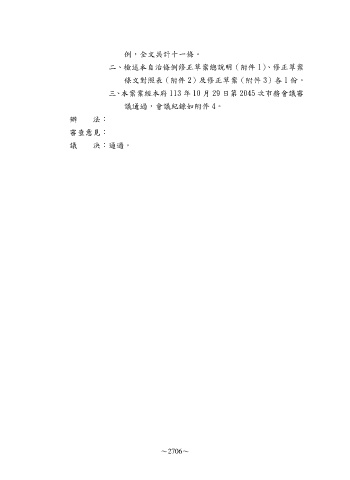 例,全文共計十一條。 二、檢送本自治條例修正草案總說明(附件 1)、修正草案 條文對照表(附件 2)及修正草案(附件 3)各 1 份。 三、本案業經本府 113 年 10 月 29 日第 2045 次市務會議審 議通過,會議紀錄如附件 4。 辦 法: 審查意見: 議 決:通過。 ~2706~