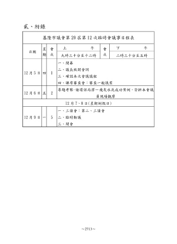 貳、附錄 基隆市議會第 20 屆第 12 次臨時會議事日程表 星 會 上 午 會 下 午 日期 期 次 九時三十分至十二時 次 二時三十分至五時 一、開幕 二、議長致開會詞 12 月 5 日 四 1 三、確認本次會議議程 四、聯席審查會:審查一般議案 專題考察-請環保局擇一飛灰水洗成功案例,安排本會議 12 月 6 日 五 2 員現場觀摩 12 月 7、8 日(星期例假日) 一、三讀會:第二、三讀會 12 月 9 日 一 5 二、臨時動議 三、閉會 ~2713~