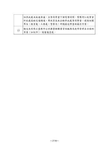 但因此處尚無避車道,且等待學童下課需要時間,警察同仁經常會 於此處協助交通暢通,導致家長無法臨停此處等待學童,建請相關 單位(教育處、工務處、警察局)研議接送學童的最佳方案。 檢送本府修正基隆市公共圖書館圖書資訊服務及使用管理自治條例 13 草案(如附件),請審議惠復。 ~2730~