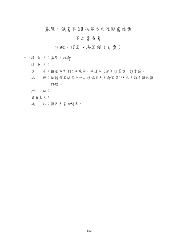 基隆市議會第 20 屆第 5 次定期會提案 第二審查會 財政、預算、決算類(九案) 一、提 案 人:基隆市政府 連 署 人: 案 由:檢送本市 114 年度第一次追加(減)預算案,請審議。 說 明:依據預算法第八十二條規定及本府第 2068 次市務會議決議 辦理。 辦 法: 審查意見: 議 決:議決內容如附表。 1182