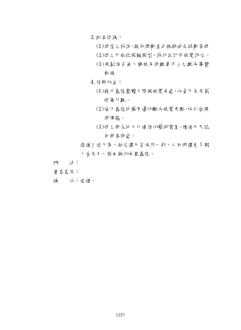 3.配套建議: (1)與屋主協調,提供獎勵金或稅賦減免鼓勵參與 (2)建立可視性模擬模型,協助設計前視覺評估。 (3)規劃結合無人機視角與觀景平台之觀光導覽 動線 4.預期效益: (1)提升基隆整體天際線視覺美感,改善市區老舊 建築外觀。 (2)強化基隆地標周邊的觀光視覺亮點,吸引拍照 與傳播。 (3)建立與在地文化連結的藝術裝置,增進市民認 同與參與感。 透過上述方案,相信讓市容煥然一新,也同時讓更多國 人看見不一樣面貌的美麗基隆。 辦 法: 審查意見: 議 決:通過。 1227