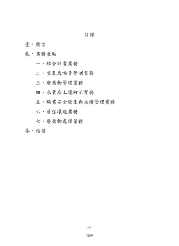目錄 壹、 前言 貳、 業務重點 一、綜合計畫業務 二、空氣及噪音管制業務 三、廢棄物管理業務 四、水質及土壤防治業務 五、職業安全衛生與永續管理業務 六、清潔環境業務 七、廢棄物處理業務 參、 結語 ~3~ 1269