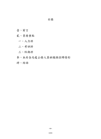 目錄 壹、前言 貳、業務重點 一、人力科 二、考訓科 三、給與科 參、本府各局處公務人員缺額與招聘情形 肆、結語 ~85~ 1351