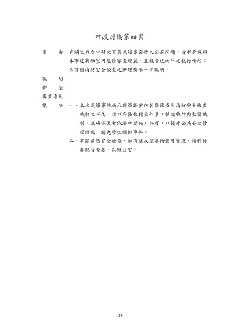 市政討論第四案 案 由:有關近日台中新光百貨氣爆案引發之公安問題,請市府說明 本市建築物室內裝修審查規範,並報告近兩年之執行情形; 另有關消防安全檢查之辦理情形一併說明。 說 明: 辦 法: 審查意見: 議 決:一、本次氣爆事件揭示建築物室內裝修審查及消防安全檢查 機制之不足,請市府強化稽查作業,精進執行與監督機 制,並確保業者依法申請施工許可,以提升公共安全管 理效能,避免發生類似事件。 二、有關消防安全檢查,如有違反建築物使用管理,請都發 處配合查處,以維公安。 126