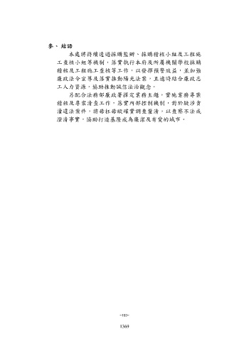 參、 結語 本處將持續透過採購監辦、採購稽核小組及工程施 工查核小組等機制,落實執行本府及所屬機關學校採購 稽核及工程施工查核等工作,以發揮預警效益,並加強 廉政法令宣導及落實推動陽光法案,且適時結合廉政志 工人力資源,協助推動誠信法治觀念。 另配合法務部廉政署擇定業務主題,實施業務專案 稽核及專案清查工作,落實內部控制機制,對於疑涉貪 瀆違法案件,將毋枉毋縱確實調查釐清,以查察不法或 澄清事實,協助打造基隆成為廉潔及有愛的城市。 ~103~ 1369