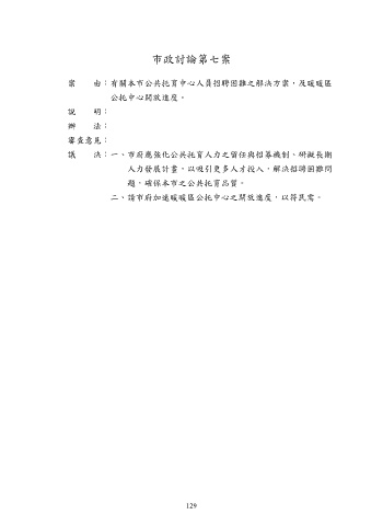 市政討論第七案 案 由:有關本市公共托育中心人員招聘困難之解決方案,及暖暖區 公托中心開放進度。 說 明: 辦 法: 審查意見: 議 決:一、市府應強化公共托育人力之留任與招募機制、研擬長期 人力發展計畫,以吸引更多人才投入,解決招聘困難問 題,確保本市之公共托育品質。 二、請市府加速暖暖區公托中心之開放進度,以符民需。 129