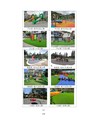 中正區-真砂社區公園 中正區-真砂社區公園 中山區-仁安公園 中山區-仁安公園 暖暖區-碇內 15 號公園 暖暖區-碇內 15 號公園 暖暖區-暖江兒童公園 暖暖區-暖江兒童公園 七堵區-長興公園 七堵區-長興公園 ~122~ 1388