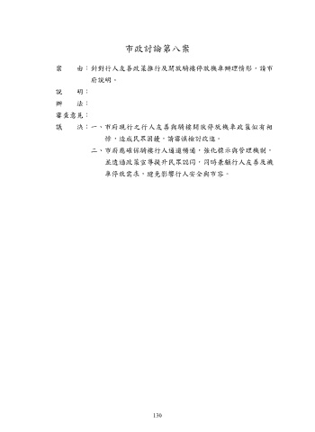 市政討論第八案 案 由:針對行人友善政策推行及開放騎樓停放機車辦理情形,請市 府說明。 說 明: 辦 法: 審查意見: 議 決:一、市府現行之行人友善與騎樓開放停放機車政策似有相 悖,造成民眾困擾,請審慎檢討改進。 二、市府應確保騎樓行人通道暢通,強化標示與管理機制, 並透過政策宣導提升民眾認同,同時兼顧行人友善及機 車停放需求,避免影響行人安全與市容。 130