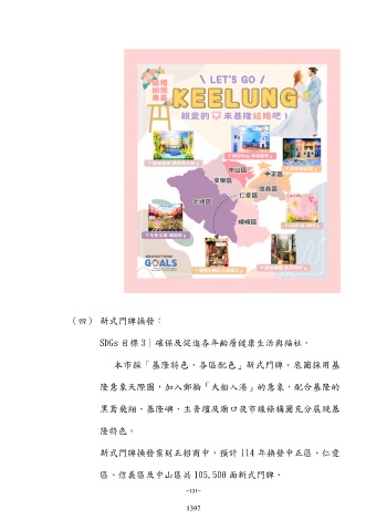 (四) 新式門牌換發: SDGs 目標 3|確保及促進各年齡層健康生活與福祉。 本市採「基隆特色、各區配色」新式門牌。底圖採用基 隆意象天際圖,加入郵輪「大船入港」的意象,配合基隆的 黑鳶飛翔、基隆嶼、主普壇及廟口夜市線條構圖充分展現基 隆特色。 新式門牌換發案刻正招商中,預計 114 年換發中正區、仁愛 區、信義區及中山區共 105,500 面新式門牌。 ~131~ 1397