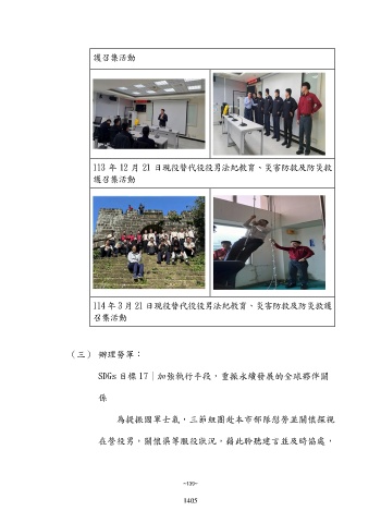 護召集活動 113 年 12 月 21 日現役替代役役男法紀教育、災害防救及防災救 護召集活動 114 年 3 月 21 日現役替代役役男法紀教育、災害防救及防災救護 召集活動 (三) 辦理勞軍: SDGs 目標 17|加強執行手段,重振永續發展的全球夥伴關 係 為提振國軍士氣,三節組團赴本市部隊慰勞並關懷探視 在營役男,關懷渠等服役狀況,藉此聆聽建言並及時協處, ~139~ 1405
