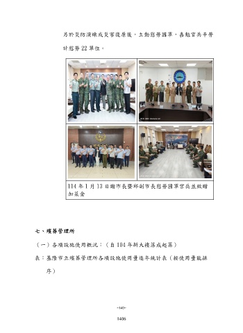 另於災防演練或災害復原後,主動慰勞國軍,嘉勉官兵辛勞 計慰勞 22 單位。 114 年 1 月 13 日謝市長暨邱副市長慰勞國軍官兵並致贈 加菜金 七、殯葬管理所 (一)各項設施使用概況:(自 104 年新大樓落成起算) 表:基隆市立殯葬管理所各項設施使用量逐年統計表(按使用量能排 序) ~140~ 1406