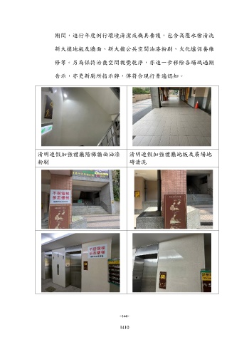 期間,進行年度例行環境清潔或機具養護,包含高壓水槍清洗 新大樓地板及牆面、新大樓公共空間油漆粉刷、火化爐保養維 修等。另為保持治喪空間視覺乾淨,亦進一步移除各場域過期 告示,亦更新廁所指示牌,俾符合現行普遍認知。 清明連假加強禮廳階梯牆面油漆 清明連假加強禮廳地板及廣場地 粉刷 磚清洗 ~144~ 1410