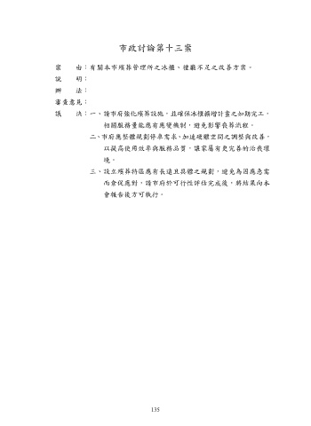 市政討論第十三案 案 由:有關本市殯葬管理所之冰櫃、禮廳不足之改善方案。 說 明: 辦 法: 審查意見: 議 決:一、請市府強化殯葬設施,並確保冰櫃擴增計畫之如期完工, 相關服務量能應有應變機制,避免影響喪葬流程。 二、市府應整體規劃停車需求、加速硬體空間之調整與改善, 以提高使用效率與服務品質,讓家屬有更完善的治喪環 境。 三、設立殯葬特區應有長遠且具體之規劃,避免為因應急需 而倉促應對,請市府於可行性評估完成後,將結果向本 會報告後方可執行。 135