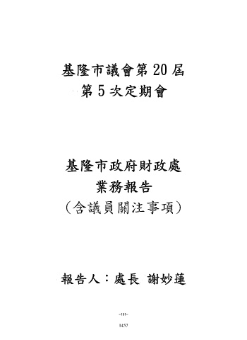 基隆市議會第 20 屆 第 5 次定期會 基隆市政府財政處 業務報告 (含議員關注事項) 報告人:處長 謝妙蓮 ~191~ 1457
