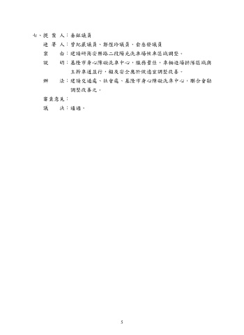 七、提 案 人:秦鉦議員 連 署 人:曾紀嚴議員、鄭愷玲議員、俞叁發議員 案 由:建請研商安樂路二段陽光洗車場候車區域調整。 說 明:基隆市身心障礙洗車中心,服務量佳,車輛進場排隊區域與 主幹車道並行,顧及安全應於做適宜調整改善。 辦 法:建請交通處、社會處、基隆市身心障礙洗車中心,聯合會勘 調整改善之。 審查意見: 議 決:通過。 ~5~ 5