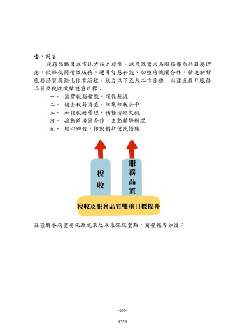 壹、前言 稅務局職司本市地方稅之稽徵,以民眾需求為服務導向的服務理 念,做好稅捐稽徵服務,運用智慧科技,加強跨機關合作,精進創新 服務品質及簡化作業流程,致力以下五大工作目標,以達成提升服務 品質及稅收徵績雙重目標: 一、 落實稅捐稽徵,確保稅源 二、 健全稅籍清查,維護租稅公平 三、 加強稅務管理,積極清理欠稅 四、 推動跨機關合作,主動輔導辦理 五、 貼心辦稅,推動創新便民措施 茲謹將本局重要施政成果及未來施政重點,簡要報告如後: ~260~ 1526