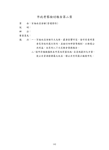 市政考察檢討報告第二案 案 由:百福水漾會館(營運情形) 說 明: 辦 法: 審查意見: 議 決:一、百福水漾會館年久失修,嚴重影響市容,請市府查明業 者是否依約履行契約,並檢討內部督導機制,以維護公 共利益,本案列入下次定期會業務報告。 二、請市府積極盤點本市其他閒置設施,妥善規劃活化方案, 使公共資源發揮最大效益,讓公共空間真正服務市民。 142