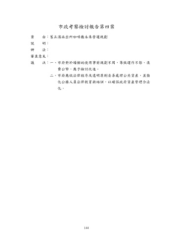 市政考察檢討報告第四案 案 由:舊正濱派出所咖啡廳未來營運規劃 說 明: 辦 法: 審查意見: 議 決:一、市府對於場館的使用事前規劃不周,導致運作不彰、浪 費公帑,應予檢討改進。 二、市府應依法律程序及透明原則妥善處理公共資產,並強 化公務人員法律教育與培訓,以確保政府資產管理合法 化。 144