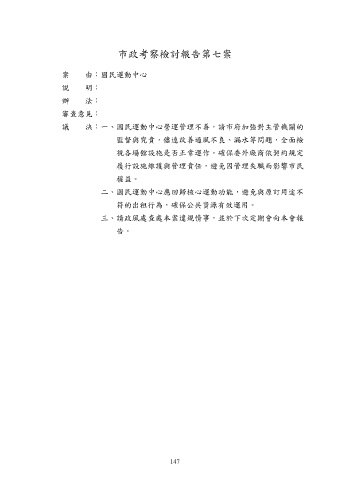 市政考察檢討報告第七案 案 由:國民運動中心 說 明: 辦 法: 審查意見: 議 決:一、國民運動中心營運管理不善,請市府加強對主管機關的 監督與究責,儘速改善通風不良、漏水等問題,全面檢 視各場館設施是否正常運作,確保委外廠商依契約規定 履行設施維護與管理責任,避免因管理失職而影響市民 權益。 二、國民運動中心應回歸核心運動功能,避免與原訂用途不 符的出租行為,確保公共資源有效運用。 三、請政風處查處本案違規情事,並於下次定期會向本會報 告。 147