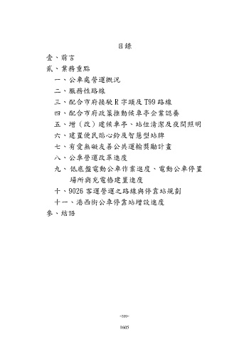 目錄 壹、前言 貳、業務重點 一、公車處營運概況 二、服務性路線 三、配合市府接駛 R 字頭及 T99 路線 四、配合市府政策推動候車亭企業認養 五、增(改)建候車亭、站位清潔及夜間照明 六、建置便民貼心鈴及智慧型站牌 七、有愛無礙友善公共運輸獎勵計畫 八、公車營運改革進度 九、低底盤電動公車作業進度、電動公車停置 場所與充電樁建置進度 十、9026 客運營運之路線與停靠站規劃 十一、港西街公車停靠站增設進度 參、結語 ~339~ 1605