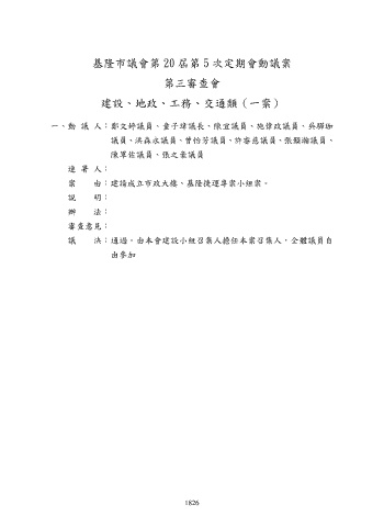 基隆市議會第 20 屆第 5 次定期會動議案 第三審查會 建設、地政、工務、交通類(一案) 一、動 議 人:鄭文婷議員、童子瑋議長、陳宜議員、施偉政議員、吳驊珈 議員、洪森永議員、曾怡芳議員、許睿慈議員、張顥瀚議員、 陳軍佐議員、張之豪議員 連 署 人: 案 由:建請成立市政大樓、基隆捷運專案小組案。 說 明: 辦 法: 審查意見: 議 決:通過。由本會建設小組召集人擔任本案召集人,全體議員自 由參加 1826