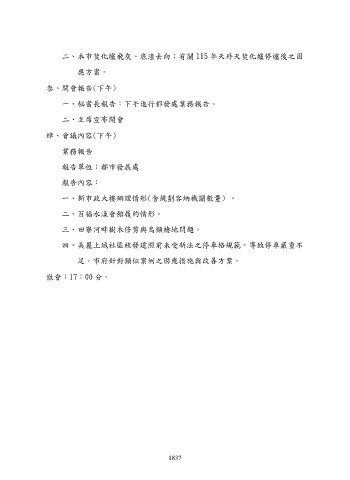 二、本市焚化爐飛灰、底渣去向;有關 115 年天外天焚化爐停爐後之因 應方案。 叁、開會報告(下午) 一、秘書長報告:下午進行都發處業務報告。 二、主席宣布開會 肆、會議內容(下午) 業務報告 報告單位:都市發展處 報告內容: 一、新市政大樓辦理情形(含規劃容納機關數量) 。 二、百福水漾會館履約情形。 三、田寮河畔樹木修剪與鳥類棲地問題。 四、美麗上城社區核發建照前未受新法之停車格規範,導致停車嚴重不 足,市府針對類似案例之因應措施與改善方案。 散會:17:00 分。 1837