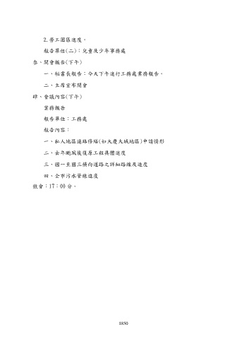 2.勞工園區進度。 報告單位(二):兒童及少年事務處 叁、開會報告(下午) 一、秘書長報告:今天下午進行工務處業務報告。 二、主席宣布開會 肆、會議內容(下午) 業務報告 報告單位:工務處 報告內容: 一、私人地區道路修繕(如大慶大城地區)申請情形 二、去年颱風後復原工程具體進度 三、國一至國三橫向道路之詳細路線及進度 四、全市污水管線進度 散會:17:00 分。 1850