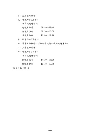 二、主席宣布開會 貳、會議內容(上午) 市長施政總質詢 何議員淑萍 08:40--09:40 鄭議員愷玲 09:50--10:50 呂議員美玲 11:00--12:00 叄、開會報告(下午): 一、議事主任報告:下午繼續進行市長施政總質詢。 二、主席宣布開會 肆、會議內容(下午) 市長施政總質詢 陳議員冠羽 14:30--15:30 許議員睿慈 15:40--16:40 散會:17:00 分。 1855