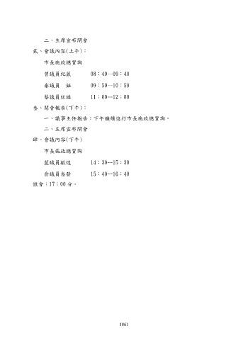 二、主席宣布開會 貳、會議內容(上午): 市長施政總質詢 曾議員紀嚴 08:40--09:40 秦議員 鉦 09:50--10:50 蔡議員旺璉 11:00--12:00 叄、開會報告(下午): 一、議事主任報告:下午繼續進行市長施政總質詢。 二、主席宣布開會 肆、會議內容(下午) 市長施政總質詢 藍議員敏煌 14:30--15:30 俞議員叁發 15:40--16:40 散會:17:00 分。 1861