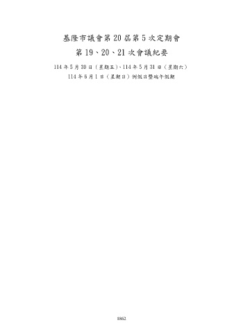 基隆市議會第 20 屆第 5 次定期會 第 19、20、21 次會議紀要 114 年 5 月 30 日(星期五)、114 年 5 月 31 日(星期六) 114 年 6 月 1 日(星期日)例假日暨端午假期 1862