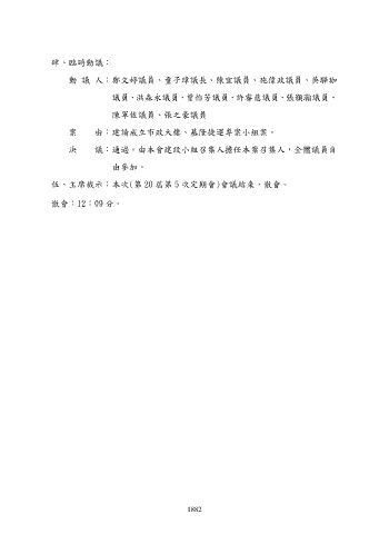 肆、臨時動議: 動 議 人:鄭文婷議員、童子瑋議長、陳宜議員、施偉政議員、吳驊珈 議員、洪森永議員、曾怡芳議員、許睿慈議員、張顥瀚議員、 陳軍佐議員、張之豪議員 案 由:建請成立市政大樓、基隆捷運專案小組案。 決 議:通過。由本會建設小組召集人擔任本案召集人,全體議員自 由參加。 伍、主席裁示:本次(第 20 屆第 5 次定期會)會議結束,散會。 散會:12:09 分。 1882